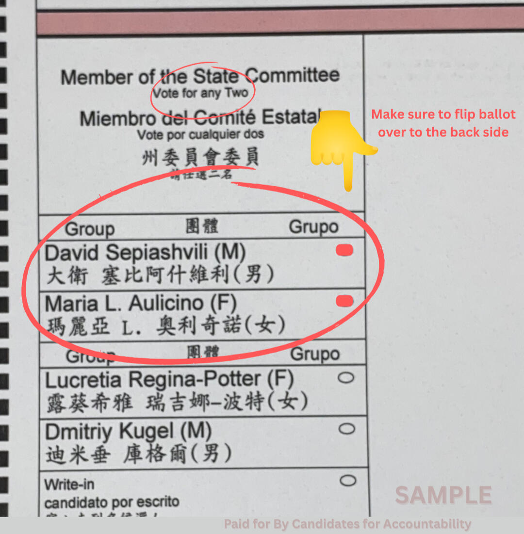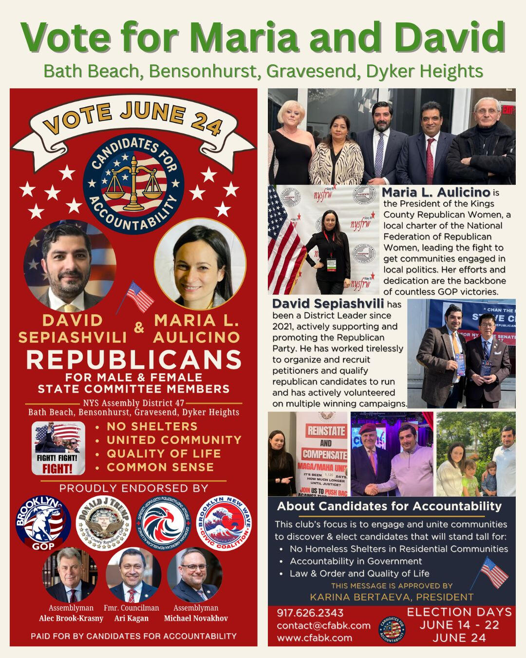 Candidates for Accountability proudly endorses and supports David Sepiashvili and Maria Aulicino for the Male and Female Member of the State Committee party position seats (vote for two), also informally known as "District Leaders." We will closely work with them to bring better stronger Republican Party representation in the 47th Assembly District. Trully Yours, Karina Bertaeva