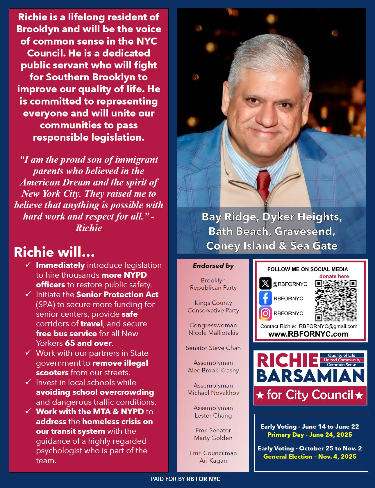 Candidates for Accountability proudly endorses and supports Richie Barsamian for the 2025 City Council District 47 race. Richie is the clear choice in this race. You can find more information about Richie on his campaign website RB For NYC. Please come out and vote for Richie, and tell all your friends and family about him.